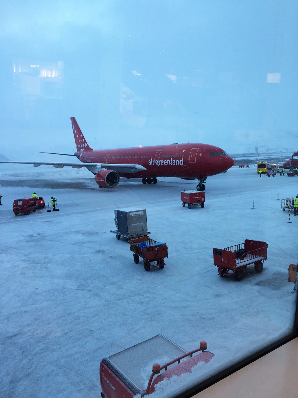 Da jeg skulle hjem en lille uge før Mikkel, fulgte han mig til lufthavnen, hvor jeg skulle med et lille propelfly til Sønderstrømfjord, hvor jeg så skulle skifte til et stort fly. Men det stormede og sneede, så afgangen blev udsat gang på gang. Mikkel tog på arbejde men ringede og foreslog, at jeg tog på firestjernet hotel, som man får tilbudt i en sådan situation. Jeg fik et lækkert værelse med udsigt over byen, seminariet og Koorsuag, hvor vi boede, og havnen og isfjorden oplyst af det vildeste pink lys, som blev til striber i pink, pastel orange, turkis og lyseblåt ud over isbjergene.