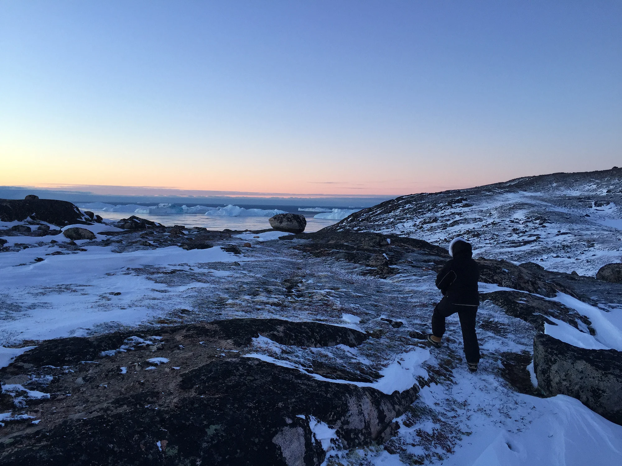 Lettere rystede over oplevelsen holdte vi nu godt fast i hinanden. Ivalo var blevet lidt træt, da det krævede mange kræfter at sidde fast, så hun begyndte at glide frem på slæden – det virkede farligt, og jeg klemte hende derfor ekstra godt fast mellem mine ben, så hun ikke skulle falde af. Vi morede os over tanken om synet af os selv – den stilling vi nu sad i – krampagtigt viklet ind i hinanden for at blive hængende. Langt om længe kom vi endelig frem til vores destination, som var et helt fantastisk sted med udsigt over isfjorden. Jeg tog et billede af Ivalo, hvor hun – som den eventyrer hun var – netop er på vej op på toppen af en bakke for at få et bedre udsyn. Jeg nåede lige akkurat at tage 4 billeder, men så frøs telefonen, for der var under 20 minusgrader! Turen tilbage var lige så vild og endnu mere krampagtig, da vi nu begge var blevet godt trætte. Vi ønskede bare at komme levende tilbage, og var opsatte på ikke at falde af, så vi brugte de sidste kræfter, vi havde. Det var sindssygt hårdt, men Ivalo var sej.